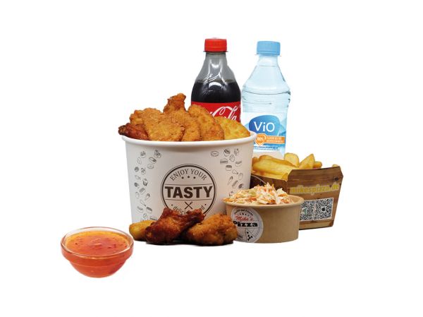 5x Crispy-Wings, 5x Hot-Wings, 10x Nuggets, 6x Stripes, 1x Pommes, 1x Coleslaw, 4x Dip, 2x Softdrink/Wasser