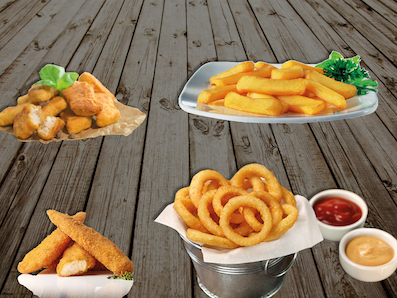 Potato Pops / Onionrings (6 Stk.) / Chicken Fingers (3 Stk.) / Chicken Nuggets (5 Stk.). Dazu 2 Dips gratis.