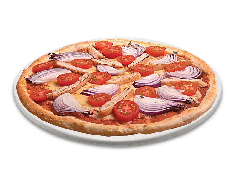 Frischer Teig, Tomatensauce, veganer Pizzaschmelz, Knoblauch, Tomatenscheiben, vegane Hühnerbruststreifen, Zwiebeln